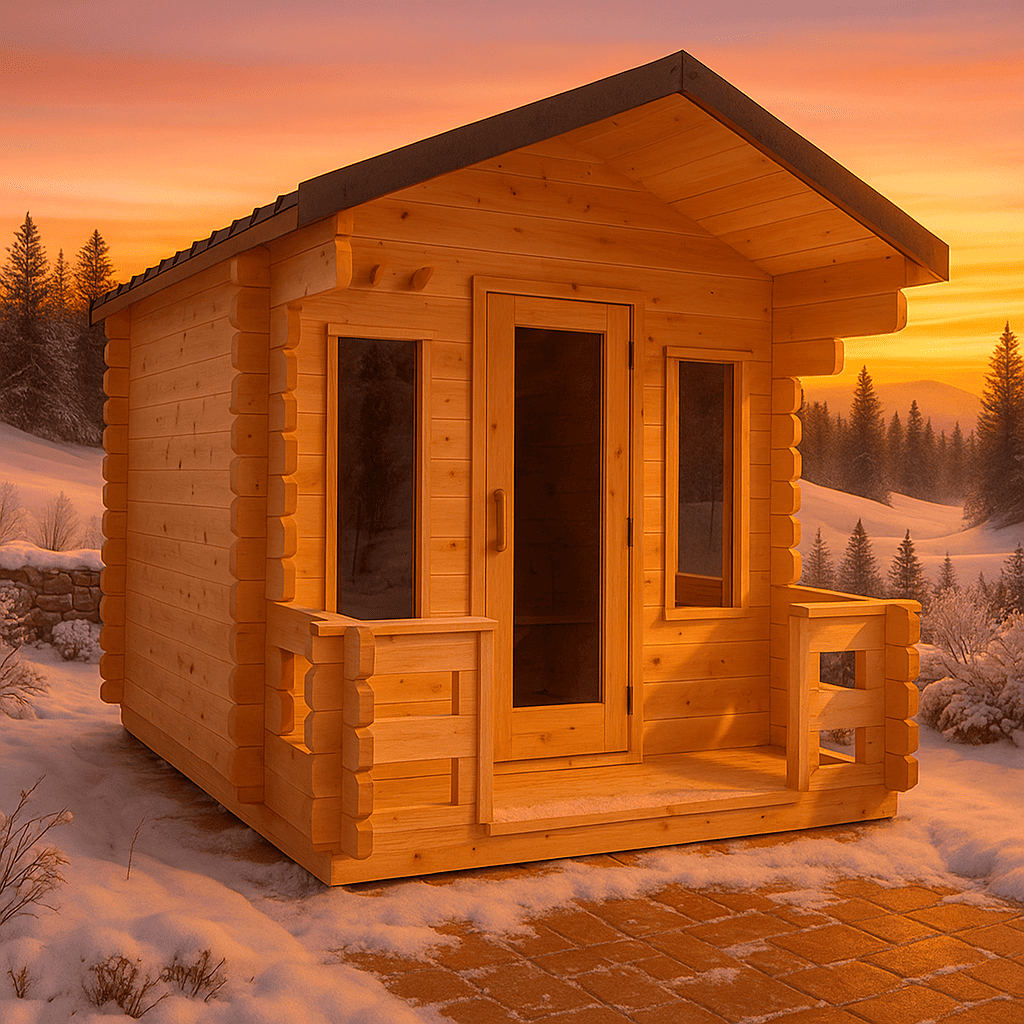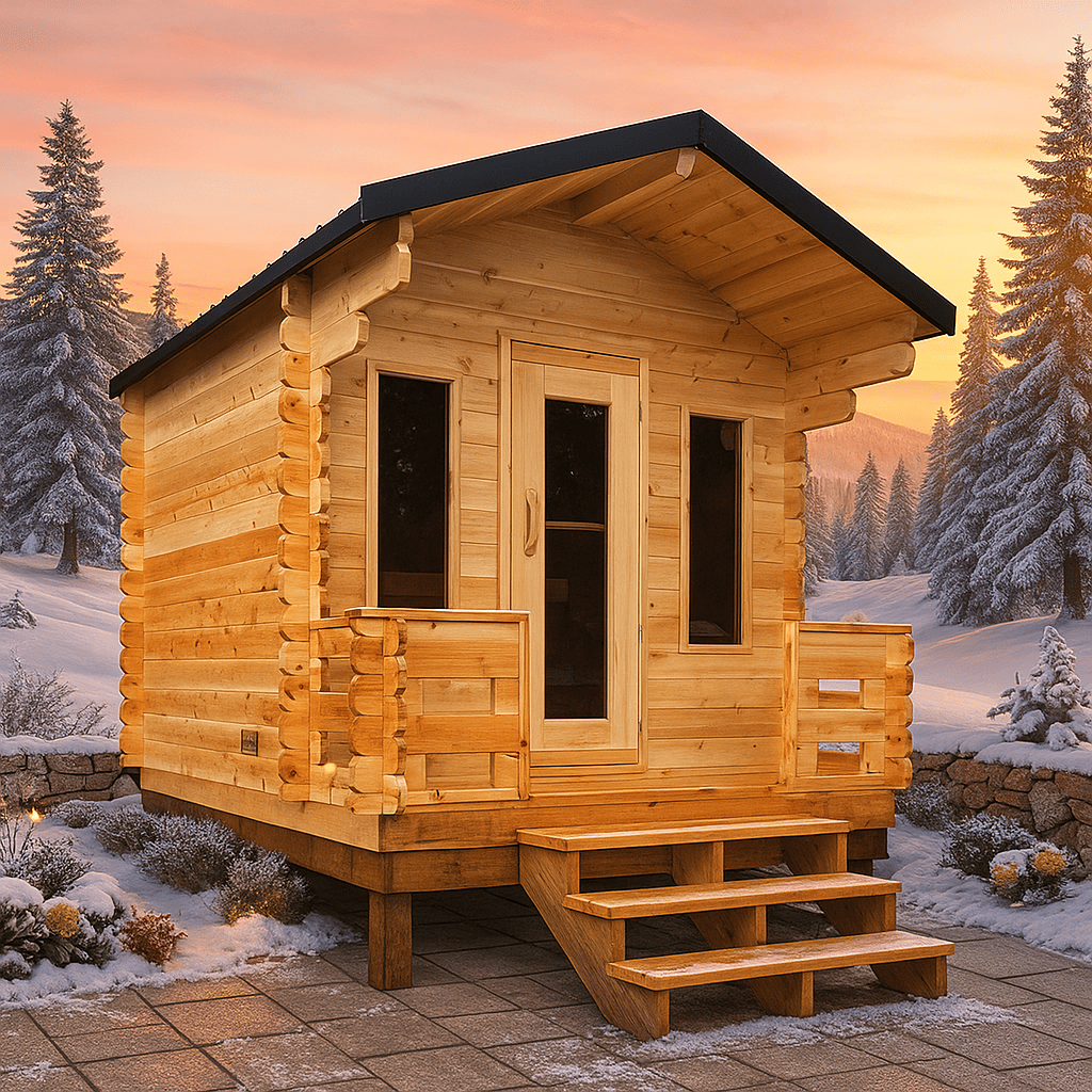 The charming cabin design with a front porch blends beautifully into gardens, forested retreats, or lakeside homes. Whether you’re enjoying winter snowfalls or summer breezes, the sauna’s weatherproof roof and solid craftsmanship ensure reliable performance in all seasons. The porch area offers a relaxing space to cool down or take in nature before and after your session.