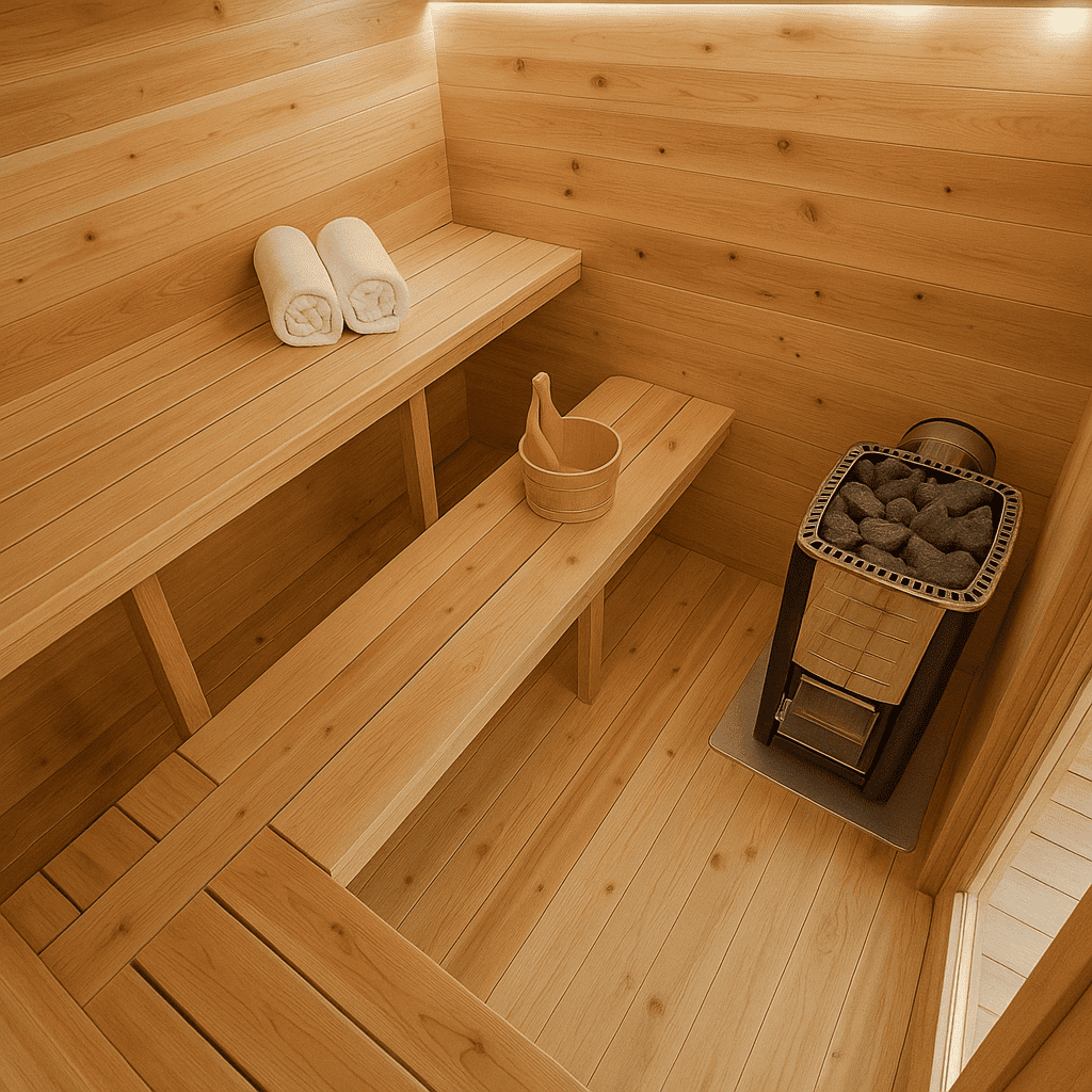 The Canadian Timber Sauna is designed to comfortably seat 2 to 4 people, making it ideal for personal relaxation, couples, or small groups. The spacious interior includes 23" wide benches for added comfort.