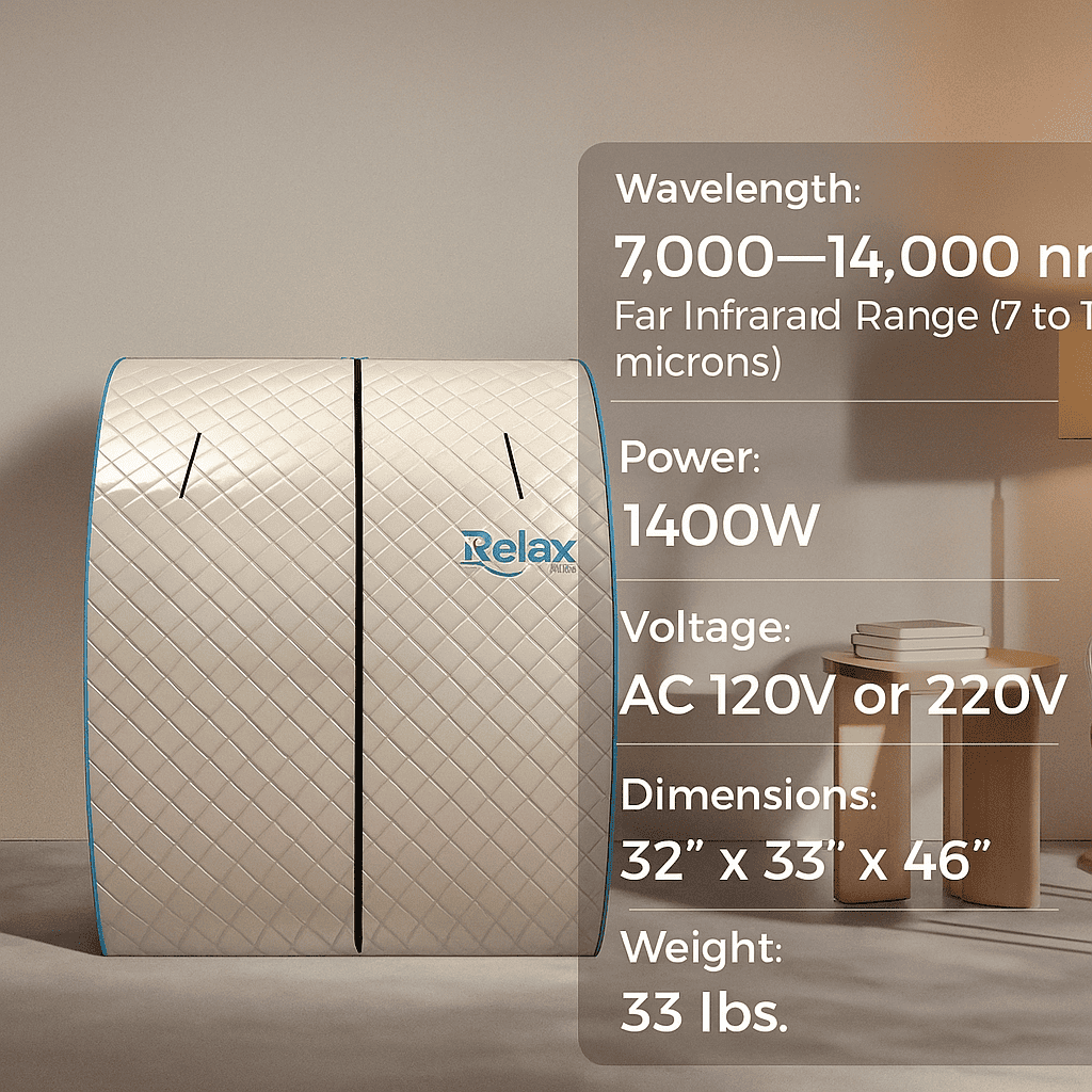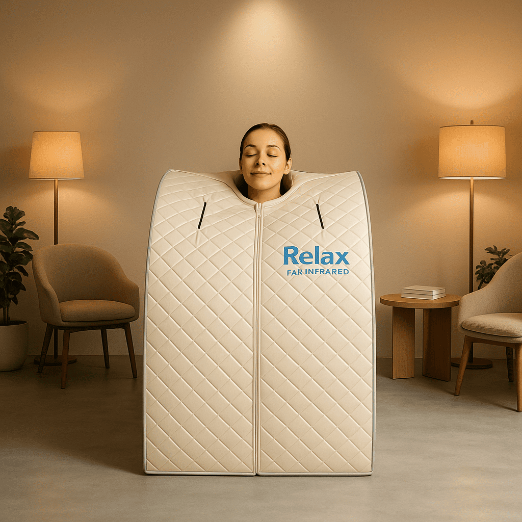 The sauna uses far infrared rays (FIR) in the 4–14 micron range, which penetrate deep into the skin and promote increased blood flow. This helps improve skin tone, boost collagen production, reduce acne, and support natural detoxification by opening up the pores through sweat.