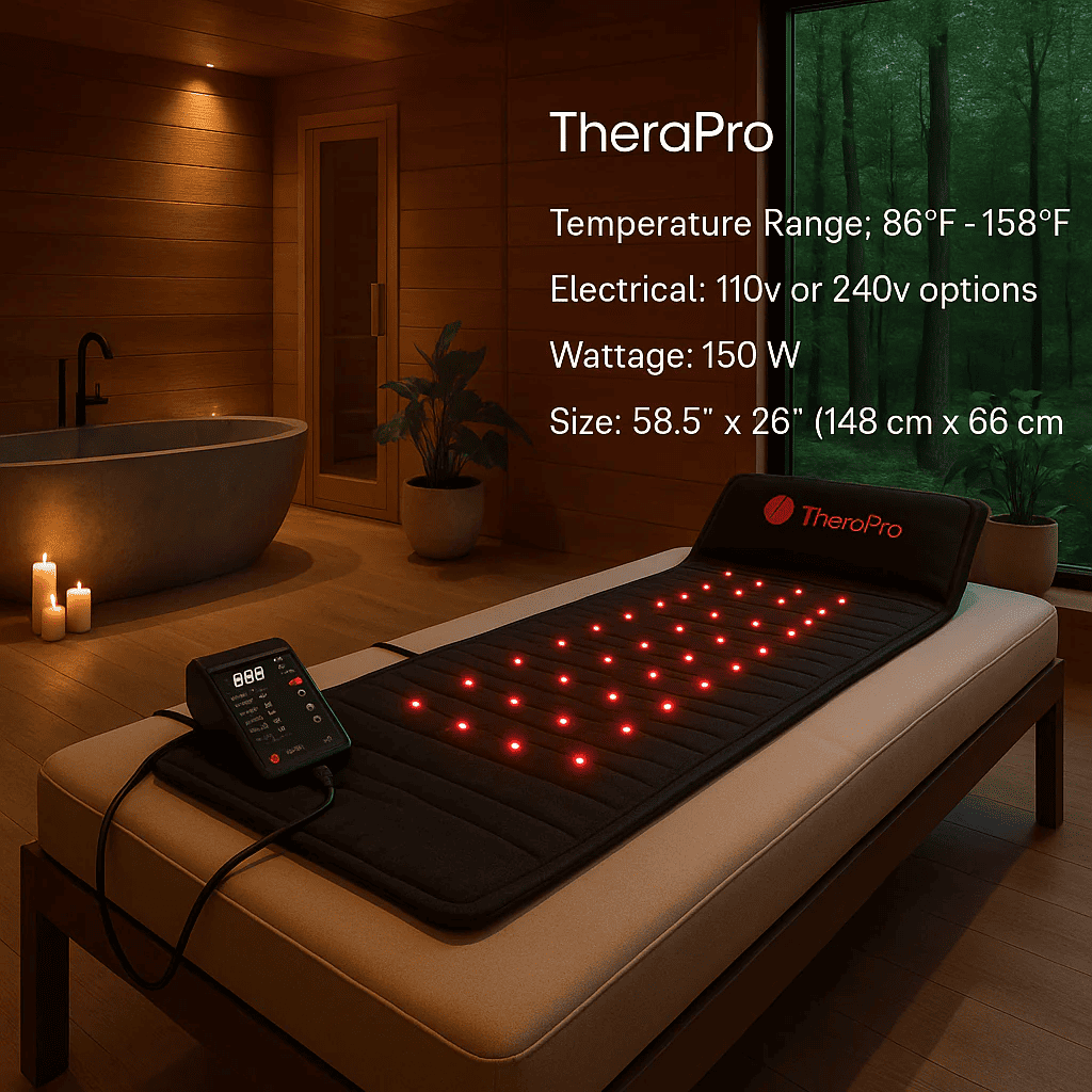 The TheraPro Pad offers full-body coverage with its spacious 58.5” x 26” (148 cm x 66 cm) design, making it perfect for home wellness or clinical use. It operates efficiently on both 110v and 240v power sources, using only 150 watts for energy-saving performance. With an adjustable temperature range of 86°F to 158°F, users can customize heat levels for gentle comfort or deep tissue therapy.